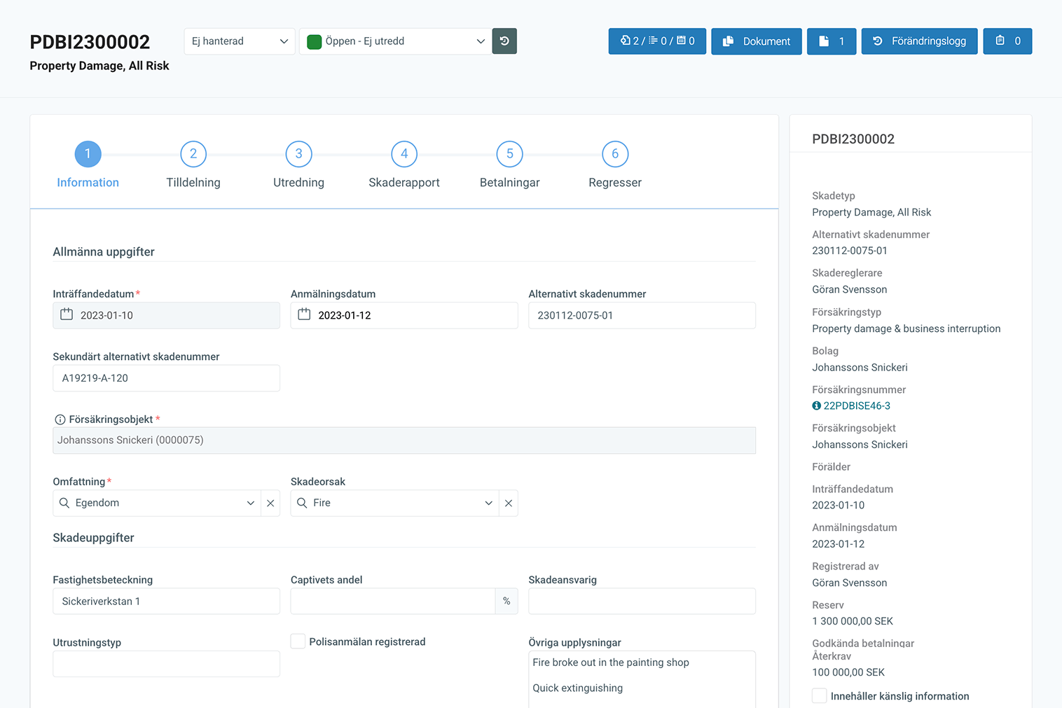 Grundläggande skadeinformation kan kompletteras med uppladdade dokument och bilder. Regleringsprocessen innefattar att lägga in självrisk, reserver och betalningar. Statistik för skadekostnader, hanteringstid och statusuppföljning presenteras i rapporter eller dashboards.
