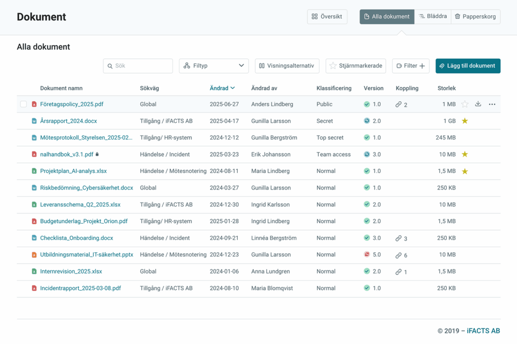 iFACTS dokumenthantering är en integrerad och kraftfull funktion som ger full kontroll över organisationens dokumentflöden. Systemet stödjer säker lagring, versionshantering, spårbarhet och behörighetsstyrning på både dokument- och mappnivå. Tack vare flexibla struktur- och klassificeringsmöjligheter kan dokument enkelt kopplas var som helst i systemstödet.