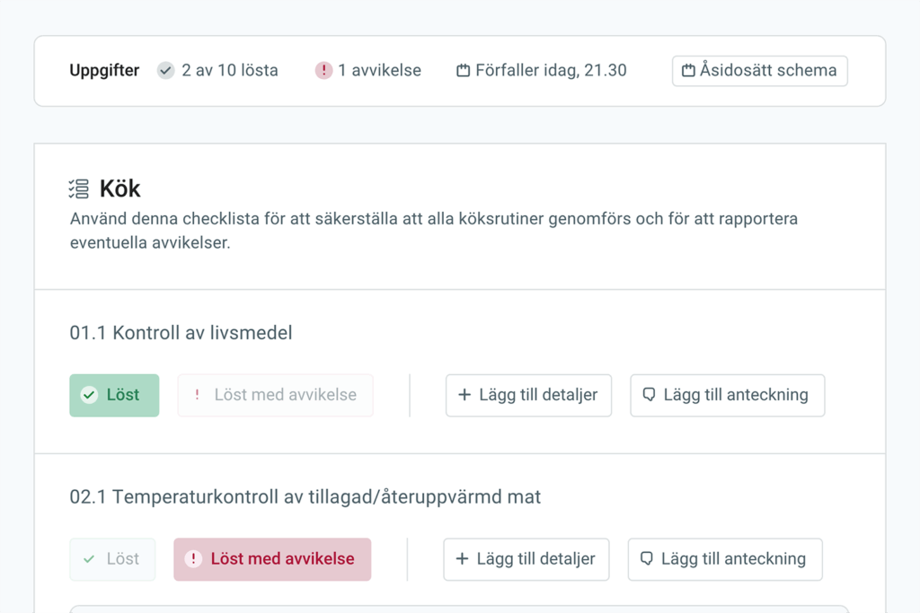 För ledningen ger plattformen en fullständig och ständigt uppdaterad översikt av utförande, avvikelser och nyckeltal via rapporter och dashboards. Detta gör uppföljningsarbetet effektivt på alla nivåer, från köket till ledningsgruppen. Automatiska påminnelser i systemet eller via e-post säkerställer att inga uppgifter glöms bort, vilket ökar efterlevnaden.